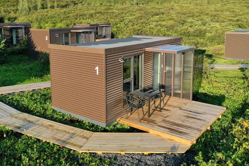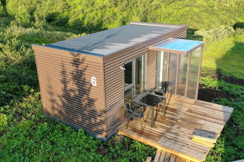 Hentar allt að 4 fullorðnum í rúmi og einum ungling eða liprum fullorðnum í efri koju. Hleðsla fyrir bíl fylgir hverju húsi.