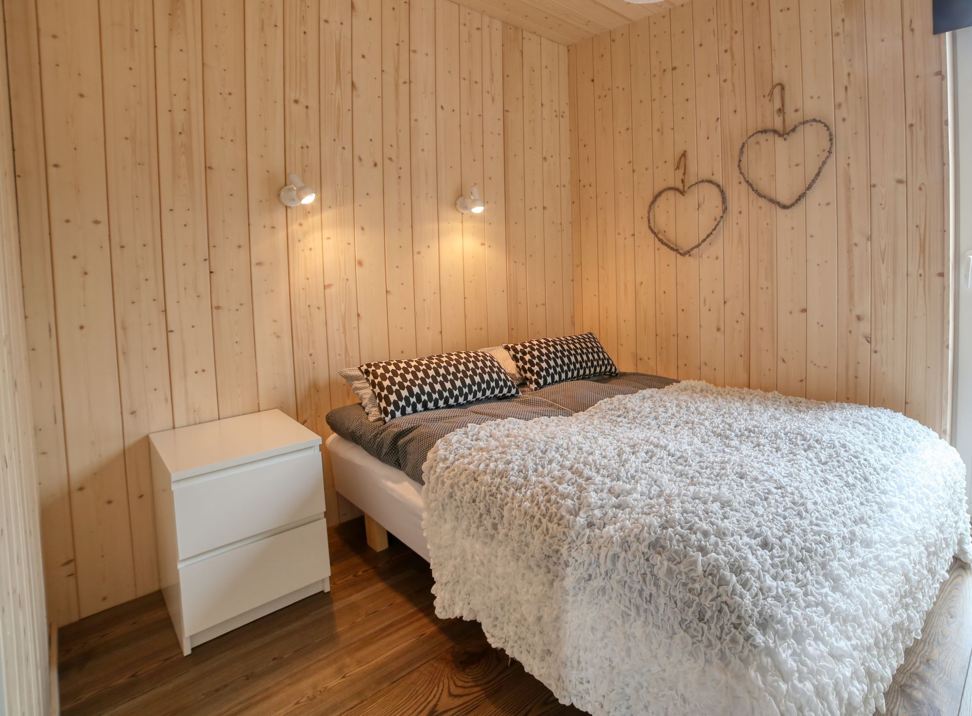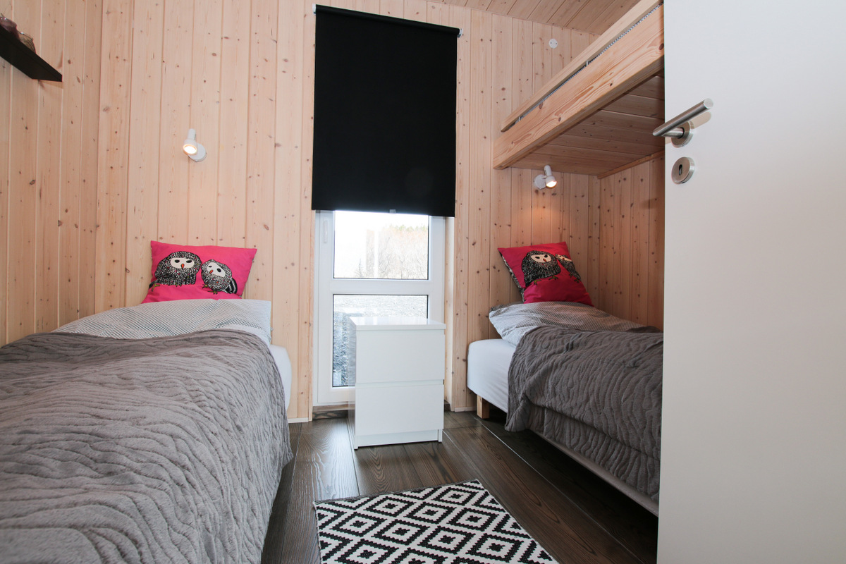 Barnaherbergi: tvö rúm + efri koja (70 x 190 cm).
