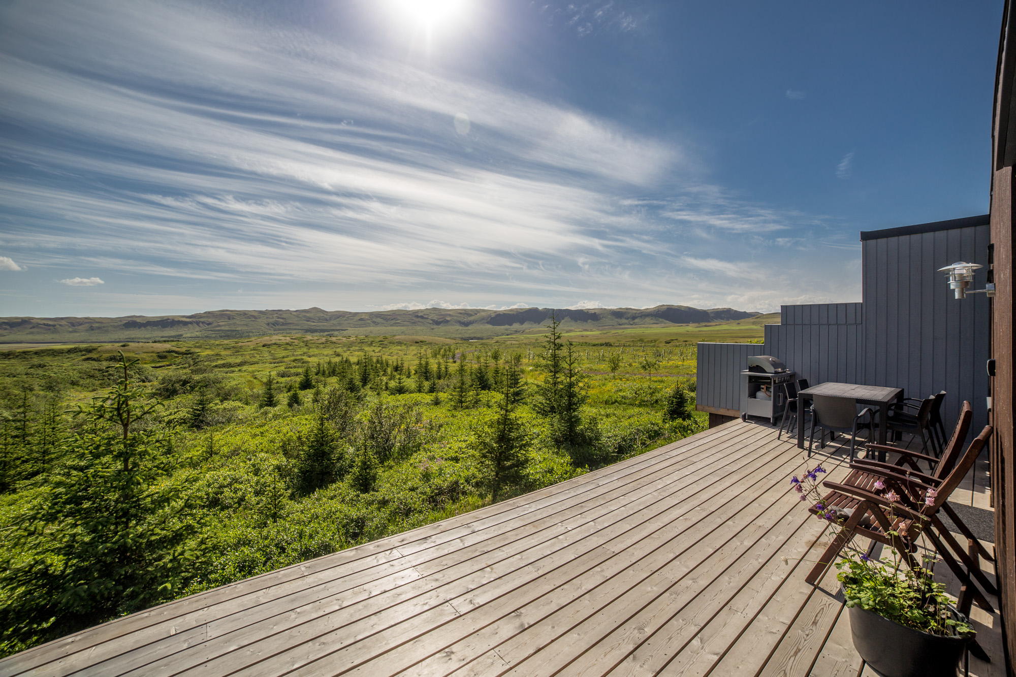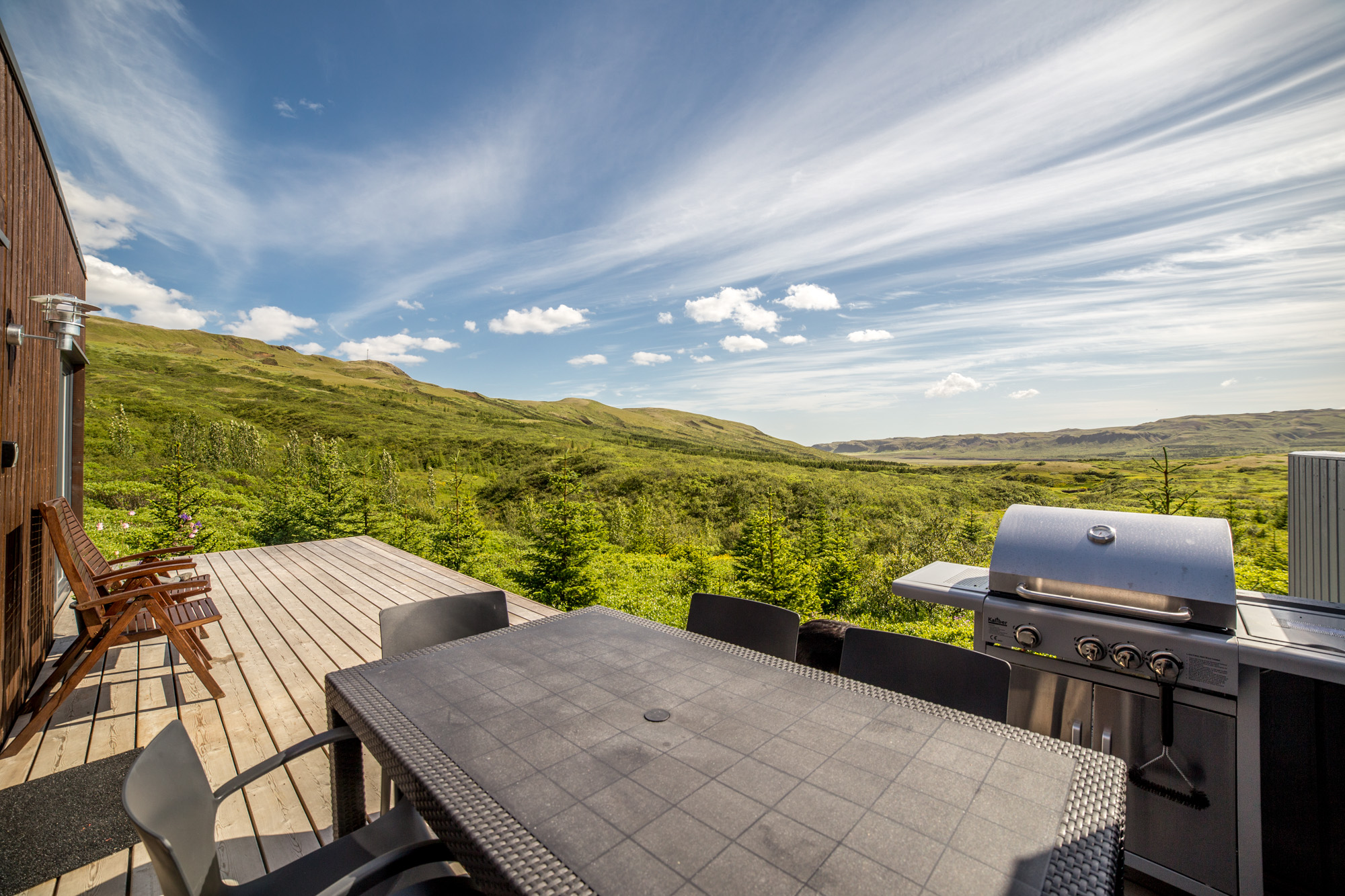 Sólpallur: Gasgrill, borð og 5 stólar,