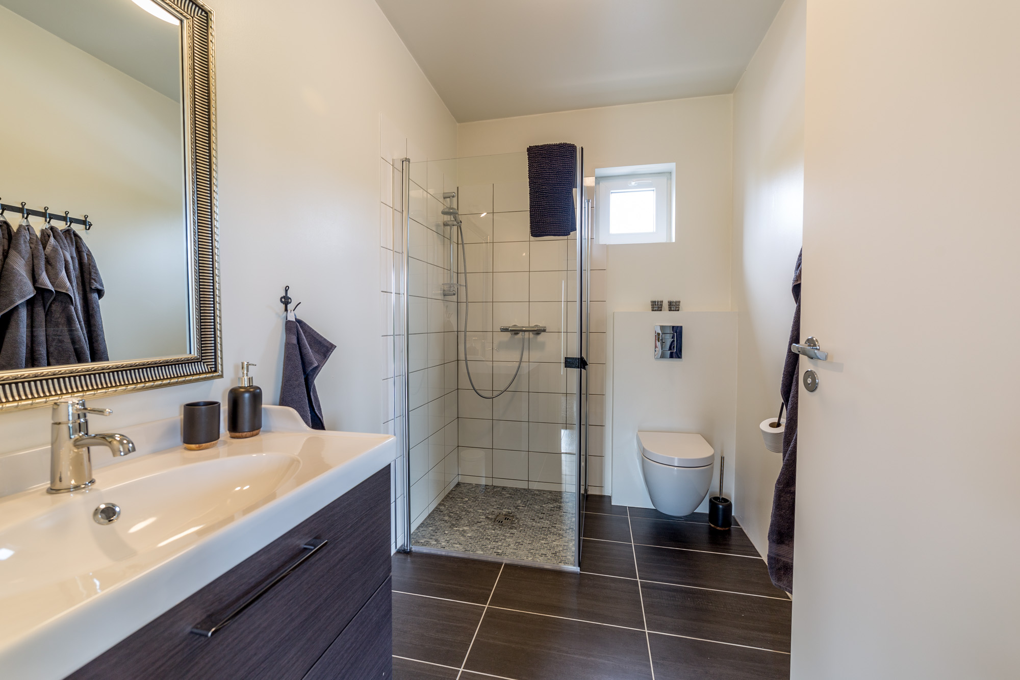 Baðherbergi: Sturta, klósett, handlaug, handsápa klósettpappír.