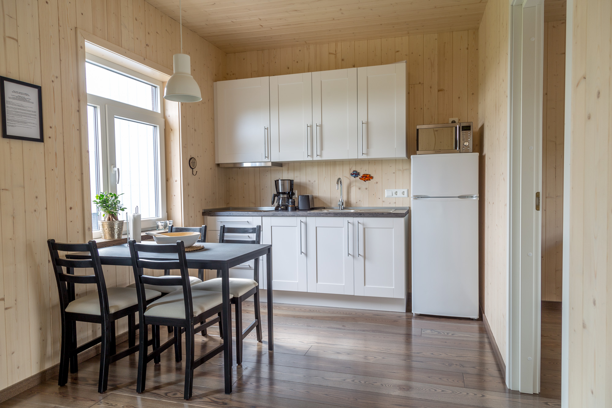 Eldhús: Ísskápur/frystir, fjórföld span keramikhella, örbylgjuofn, kaffivél, brauðrist, hraðsuðuketil og öll önnur nauðsynleg eldhúsáhöld ásamt uppþvottalegi, grunn kryddum, kaffipokum, matarolíu, neskaffi, salti og sykri. Borðstofuborð með sæti fyrir 4-5